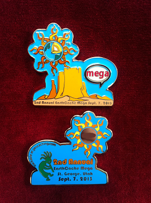 This geocoin commemorates the 2nd International Earthcache Mega Event that was held on September 7, 2013 in St. George, Utah. The front depicts the "Mega" icon and the event logo, which includes sandstone buttes common in Utah. The reverse has an image of a Kokopelli, a traditional American Indian symbol in the southwestern United States. This version has gold text and borders. The coin is fully trackable through www.geocaching.com/track.