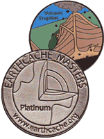 This geocoin represents the EarthCache Masters Platinum Level. It has the EarthCache Master logo on one side and a geologic cartoon of a volcanic eruption on the reverse. The coin is fully trackable through www.geocaching.com/track.