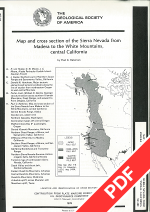 Two 35" x 40" sheets. Introduction: The Sierra Nevada cross section extends N75°E across the Sierra Nevada, through Bishop, California, to the east side of the White Mountains. Its west end joins the east end of the cross section prepared by D. C. Ross, which extends from offshore of Point Sur to Madera. The cross sections meet at the southwest corner of the U.S. Geological Survey 1:250,000 series Mariposa sheet (lat 37°N, long 120°W). The east end of the Sierra Nevada cross section is at long II8°W. Altitudes along the cross section range from 90 m (300 ft) above sea level at the west end to 3,900 m (13,000 ft) where it crosses the Sierra Nevada divide. Pre-Cenozoic metamorphic rocks and granitoids are well exposed along the line of section, except at the west end where they dip under Cenozoic sediments, and in the down faulted Owens Valley.