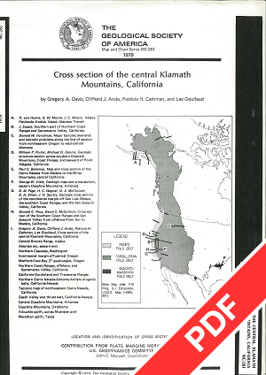 One 50" x 30" sheet. From text: The 1:62,500 geologic map and cross section of the central Klamath Mountains, California, departs from the standard 1:250,000 scale of most of the Plate Margins Working Group maps. The relatively small area treated has figured prominently in past interpretations of convergent plate tectonics along the western margin of the North American continent. In this area three of the four Klamath lithic belts or subprovinces originally designated by Irwin (1960) comprise a stacked sequence of thin, subhorizontal thrust plates separated by east-rooting faults of both middle Paleozoic and Jurassic age. Structural, stratigraphic, and chronologic relations among the several allochthonous units are described below and set constraints on theories of plate-margin evolution for this part of the Cordillera. For comparison with other cross sections in the series, cross section A-A' has been simplified and shown at 1:250,000 scale. In the following discussion major allochthonous assemblages are treated from east to west and from highest to lowest. A geologic road log describing units exposed in the north-central part of the map area has been published…