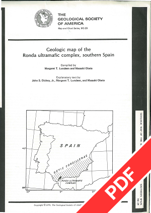One 46" x 40" sheet. From text: The Ronda ultramafic complex, a mountainous terrain of peridotites and mafic rocks, rises 1,480 m above the Costa del Sol between Marbella and Estepona in southern Spain. First mapped geologically as part of the Serrania de Ronda by Orueta in 1917, this 300-km2 complex is the world's largest and best-exposed high-temperature peridotite intrusion. Structures and petrologic features within the complex reveal a history of deformation and chemical differentiation related to its upper mantle origins and early movements. The map presented here, which is the result of many seasons of field work by us and other geologists (Buntfuss, 1970; Darot, 1973; Dürr, 1967; Loomis, 1972a; Mollat, 1968), describes both the early-formed, internal features of the complex and its present status as a fault-bounded slab among other tectonic units in the core of the western Betic Cordillera…