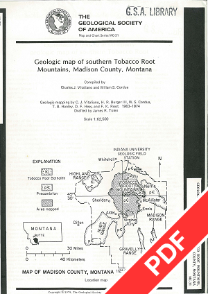 One 33" x 45" sheet. Scale 1:62,500. From text: The core of the Tobacco Root Mountains, a domal uplift of southwestern Montana, is composed of regionally metamorphosed Archean rocks that have been intruded by diabase dikes of late Precambrian age and by igneous rocks of late Mesozoic and Cenozoic age. The Archean rocks, originally a stratiform sequence of epiclastic, volcaniclastic, and carbonate sedimentary rocks, have been metamorphosed to amphibolite-granulite rank with attendant migmatization. The distribution of the metamorphic rocks and the later intrusions is shown on the map. In this report to accompany the map, the nature of the crystalline rocks is described briefly. Two thermal events affected the area in Precambrian time, one at about 2.7 b.y. B.P. and the second at about 1.6 b.y. B.P. A third event may have begun in very late Precambrian time, but is most strongly represented by changes of late Mesozoic age. Because of structural complexities, correlation of the metamorphic rocks in the Tobacco Root Mountains with Precambrian sequences elsewhere in southwestern Montana is extremely difficult.