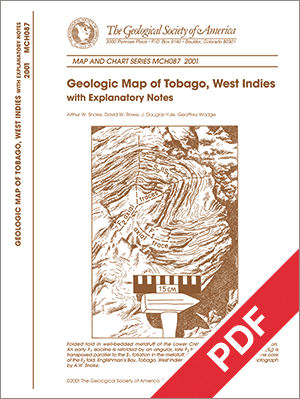 One color sheet, 65" x 44". From text: Tobago, West Indies, part of the Republic of Trinidad and Tobago, is at lat ~11°15' N and long 60°40' W. The island is a structural high composed chiefly of Mesozoic igneous and metamorphic rocks that forms part of the northeasternmost corner of the present-day South American continental shelf. It is located ~32 km northeast of Trinidad and is situated within the plate boundary zone between the South American and Caribbean plates. The Mesozoic rocks that are exposed on Tobago have no counterparts on Trinidad and are older than the exposed volcanogenic rocks or the Lesser Antilles and sedimentary rocks of Barbados. Tobago is the northeastern most exposure of the Caribbean mountain system, which can be traced eastward from the Cordillera de la Costa, north-central Venezuela, toTobago. The island of Tobago is part of the Tobago terrane of Speed and Smith-Horowitz.