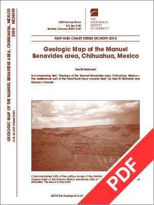 This map and text cover an area of eastern Chihuahua state adjacent to the Rio Grande and the Big Bend of Texas. The area contains an 1100-m-thick volcanic section very similar in lithology and age (by Ar-Ar dating) to that exposed in both Big Bend National and State Parks. This includes, from older to younger, a heterogeneous sequence very much like to the Chisos Formation, a thick locally derived rhyolitic flow complex comparable to the Tule Mountain trachyandesite, distal thin ignimbrites similar in age to the Mitchell Mesa ash-flow tuff (the largest unit in the Trans-Pecos volcanic field), and a caldera source for both the 31 Ma San Carlos tuff and the 28 Ma Santana tuff. The caldera is an unusual trap-door type with a hinge zone on the southwest and two separate collapse and eruption margins around the north and east. Its outer diameter is approximately 25 km, which is unusually large for the tuffs that erupted from it, suggestive of a shallow collapse. Inflation or tumescence prior to the eruptions modified a preexisting Laramide fold by bowing it outward toward the north and east; a 31.5 Ma granitoid was intruded into the fold axis, resulting in the formation of skarn deposits in the surrounding limestones of the fold.