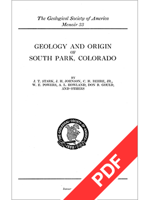South Park in central Colorado is a basin of some 900 square miles with a relatively level floor, depressed in comparison with the enclosing hills to the south and even more so as compared with the Mosquito and Front Ranges that border it elsewhere. The chief purpose of this study, which comprised three field seasons and a party ranging from 3 to 15 persons each season, was to determine the origin of the Park. Broadly speaking this proved to be partly a matter of tectonics but largely one of erosion and deposition in Tertiary and Quaternary times. Details of structure, igneous history and petrology, Tertiary and earlier stratigraphy, and Pliocene and Pleistocene development are significant by-products of the investigation.